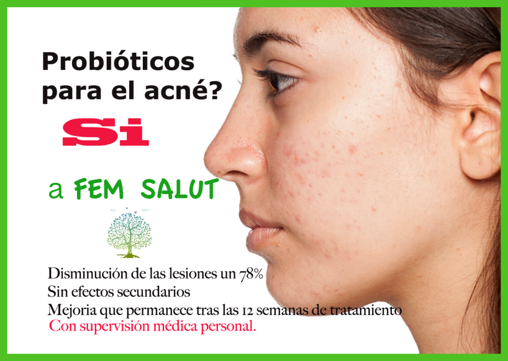 1. En FEM SALUT te ofrecemos un tratamiento de base con el PRIMER PROBIÓTICO específico para eliminar de tu piel y de tu flora intestinal las bacterias inflamatorias que crecen en los comedones y pústulas del ACNÉ. Es un tratamiento de 12 semanas con cepas exclusivas para tratar el acné. En un estudio reciente con 58 adolescentes de ambos sexos se ha comprobado una disminución del 78% de las lesiones acneicas utilizando estas cepas probióticas especificas.