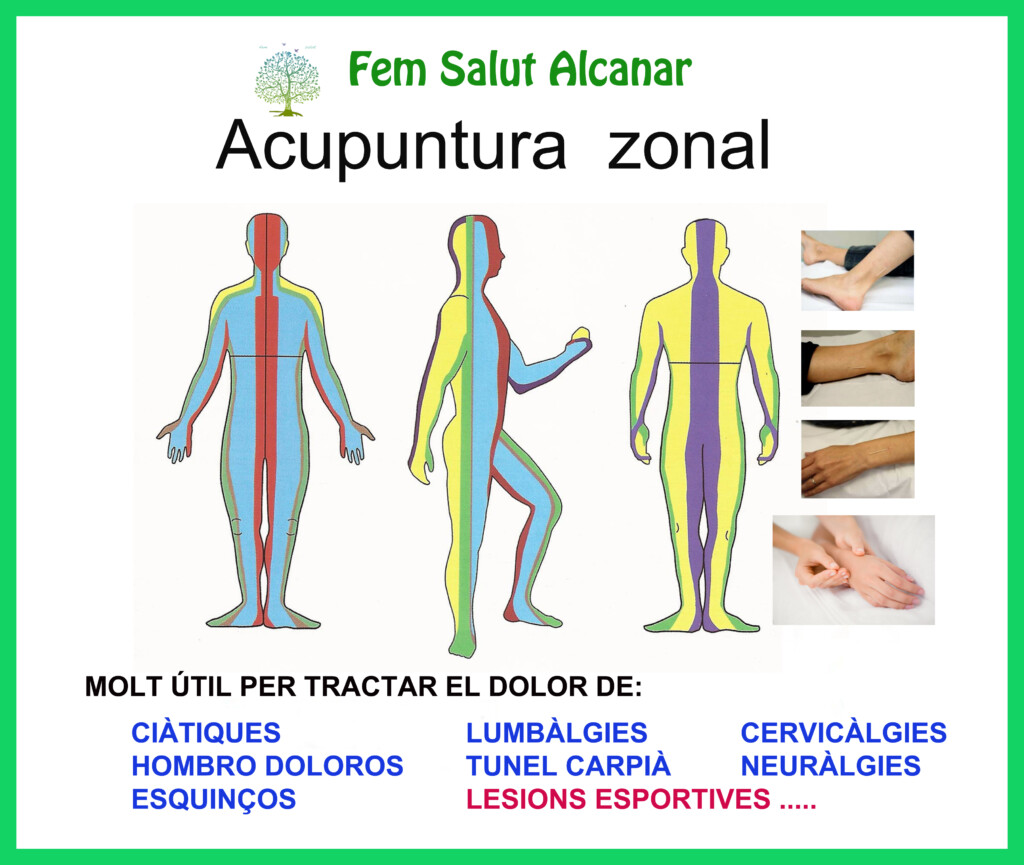 En Fem Salut utilizamos todos nuestros recursos en aliviar el dolor. Los tratamientos de nuestra medicina occidental como los analgésicos y antiinflamatorios químicos (ibuprofeno, ketoprofeno, Nolotil, tramadol…) te los podemos recetar si los precisas, evidentemente. Si no los toleras o prefieres los naturales tenemos diferentes opciones con poder analgésico comparable a los químicos. Y más recientemente hemos incorporado una nueva técnica procedente de hospitales de China y actualizada en Francia en 1970 por un neurólogo adaptándola a nuestra forma occidental de tratar el dolor: es LA ACUPUNTURA ZONAL DE MUÑECAS Y TOBILLOS. (más información en nuestra web:)