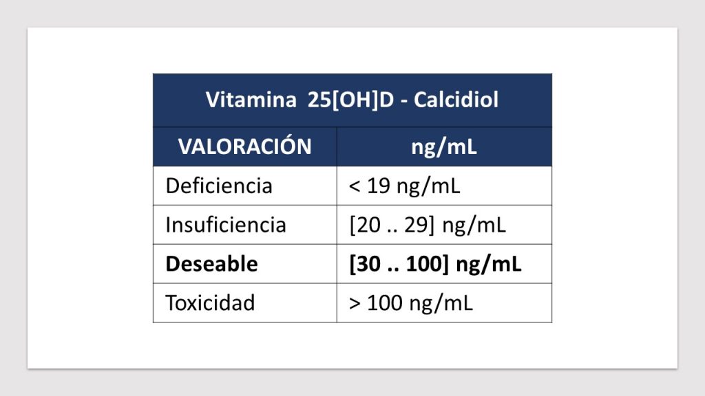 Para ello, primero va al Hígado y se convierten en 25-hidroxiVitamina D (25[OH]D) o también llamada Calcidiol, que es el parámetro que se mide en los análisis de sangre.